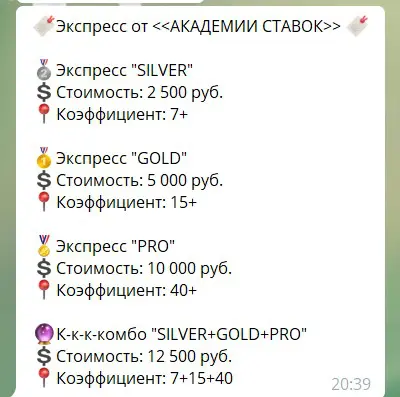 В Telegram-канале «Академия ставок» длительных подписок нет. Константин Лавров предлагает разовые экспрессы, цена которых зависит от коэффициента: