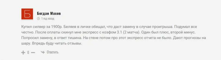 В группе покупатели оставляют восторженные отзывы, утверждая, что экспрессы приносят огромные выигрыши. Однако на независимых платформах ситуация противоположная. Один из пользователей поделился опытом: он приобрел экспресс, но вместо обещанного высокого коэффициента получил ставку с коэффициентом 3.00, которая оказалась проигрышной. Запрос на бесплатную замену был проигнорирован.