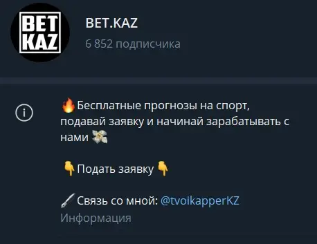 Контент канала BET.KAZ стандартен для подобных проектов. В ленте чаще всего можно увидеть бесплатные прогнозы в виде скриншотов букмекерских купонов, но без аналитики и объяснений, как принимаются решения.