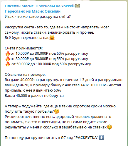 Андрей Майоров (бывший Масис Овсепян) рекламирует «услуги» по «раскрутке» счета в букмекерских конторах и псевдокурсах по ставкам, за которые он требует огромные суммы. При этом он использует обманные методы для получения прибыли от своих клиентов: