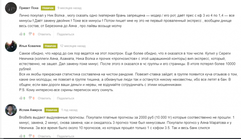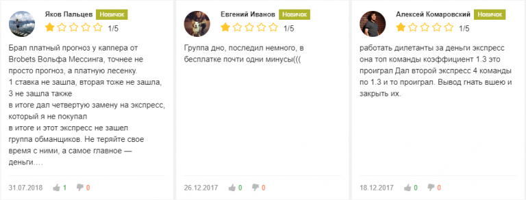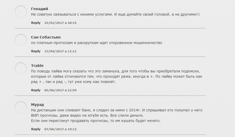 На независимых тематических форумах и сайтах можно найти исключительно негативные отзывы. Пользователи жалуются на низкую проходимость ставок и обвиняют прогнозистов в мошенничестве.
