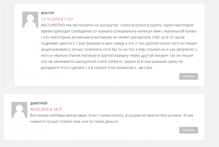 В сообществе публикуется множество положительных комментариев, однако большая часть из них выглядит сомнительно. Такие отзывы пишутся на эмоциях после нескольких успешных ставок или покупаются на биржах фриланса за минимальную плату (20-50 рублей за комментарий).