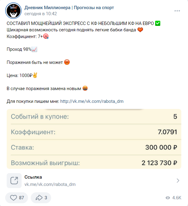 Платные экспрессы: Например, во ВКонтакте анонсируется экспресс с коэффициентом выше 7. Каппер утверждает, что проходимость достигает 98%, а при проигрыше обещает бесплатную замену. Стоимость — 1000 рублей, покупка доступна через чат по ссылке.