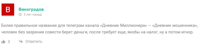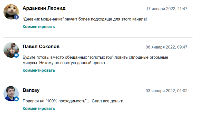 Видеоотзывы довольных клиентов на канале — заказные, купленные на специальных платформах. Реальные мнения о проекте мы нашли на сторонних сайтах: они резко негативные. Пользователи называют проект “Дневник Мошенника”, подчёркивая, что его аналитика ведёт только к убыткам.