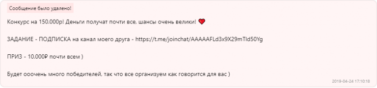 На канале регулярно организуются конкурсы, где обещаются крупные денежные призы. Например, при призовом фонде 150 000 рублей обещают выплаты каждому участнику. На деле лишь 15 человек могут что-то получить, что уже выглядит как обман.