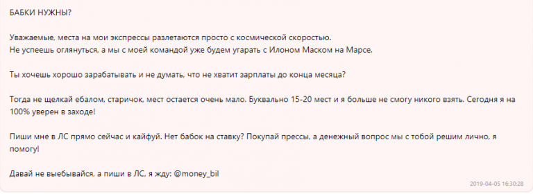На данном ресурсе подписчикам ежедневно обещают доход в 10 000–25 000 рублей. Для этого нужно зарегистрироваться у букмекера и внести депозит. Однако выплаты не производятся.