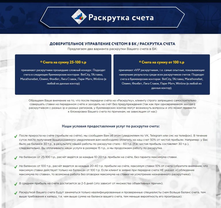 Обращаем ваше внимание, что услуги по раскрутке счета часто оказываются мошенническими. В данном случае действия действительно выполняются на счете клиента в букмекерской конторе. Однако стоит учитывать, что аналитики ничем не рискуют: если раскрутка не удалась — потери несет только клиент. К тому же возможна схема, при которой одновременно обслуживаются два клиента — одному проигрывают, а второму выигрывают средства.