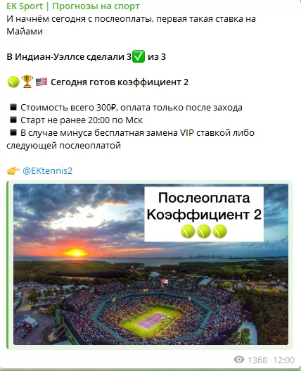 В EK Sport можно приобрести экспрессы поштучно или оформить подписку на VIP-чат. Цена одного экспресса с коэффициентом 7+ составляет 300 рублей. Подписка на VIP-чат ранее стоила 1500 рублей, а на выходные — 500 рублей. Стоимость услуг варьируется в зависимости от сезона и коэффициентов. При покупке экспрессов доступна опция послеоплаты — клиент платит только после выигрыша. Это кажется привлекательным, но часто используется мошенниками: одной группе подписчиков дают один прогноз, другой — противоположный, чтобы гарантировать положительные отзывы от части аудитории.