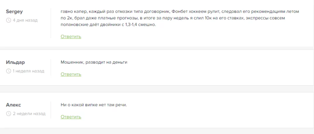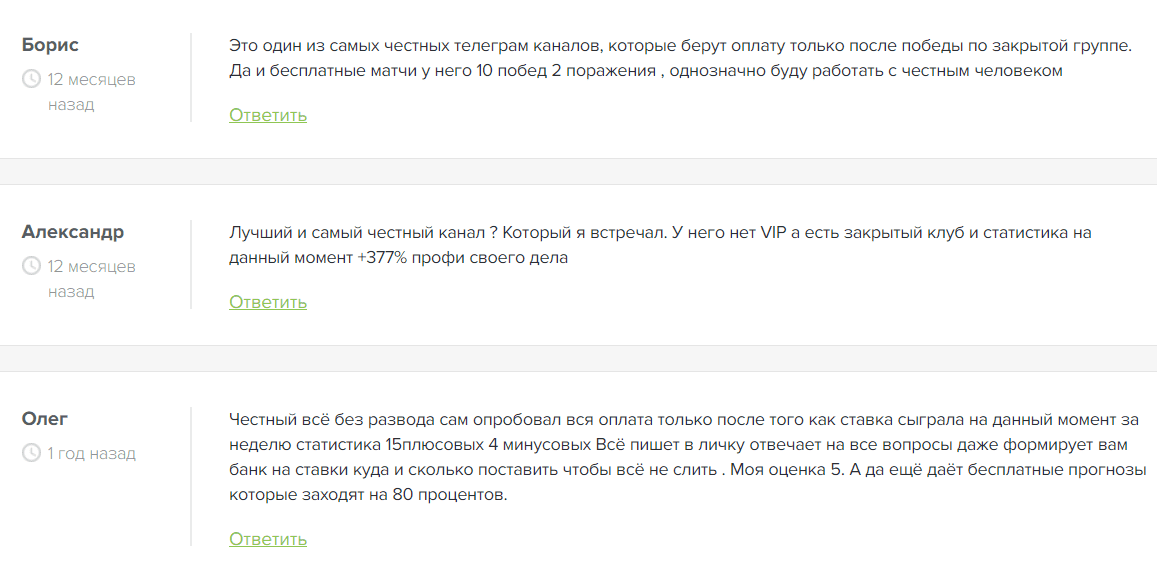 В интернете встречаются как положительные, так и отрицательные отзывы. Некоторые клиенты хвалят аналитиков за честность и неплохую проходимость, отмечая возможность заработка. Однако есть и жалобы: пользователи утверждают, что прогнозы часто проигрывают, а платные услуги, включая VIP-чат, не оправдывают ожиданий. Мнения беттеров о проекте расходятся.