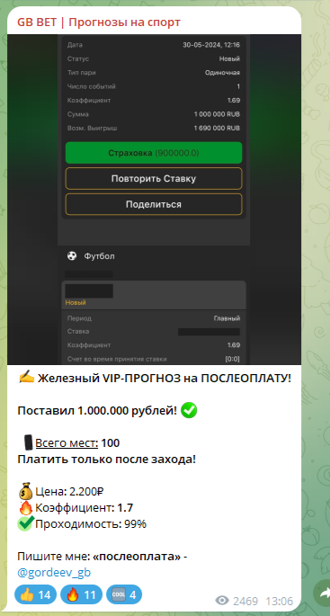 Telegram-канал «Гб Бет» Дмитрия Гордеева обещает заработок на ставках, показывая выигрыши и профессионализм. Мы изучили проект — вот выводы для тех, кто покупает прогнозы.