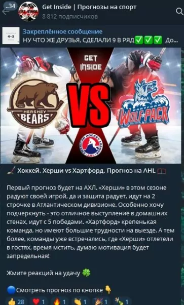 Get Inside — это Telegram-канал, специализирующийся на ставках на хоккей и футбол. После нескольких просьб о проверке проекта мы решили провести его анализ.