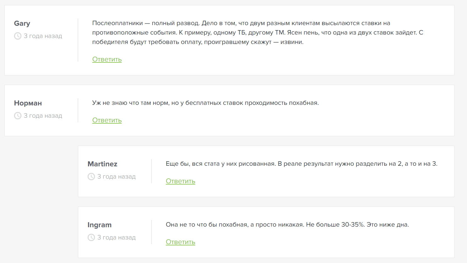 Послеоплатники полный развод. Дело в том, что двум разным клиентам высылаются ставки на противоположные события. К примеру, одному ТБ, другому ТМ. Ясен пень, что одна из двух ставок зайдет. С победителя будут требовать оплату.