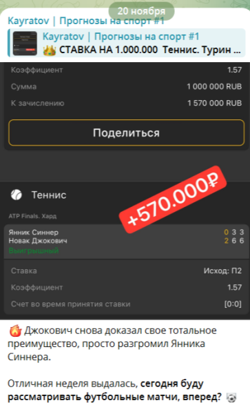 Кайратов регулярно публикует футбольные новости и несколько прогнозов в день, но комментарии в Telegram закрыты. Бесплатные ставки на теннис и футбол доступны в сообществе ВКонтакте.