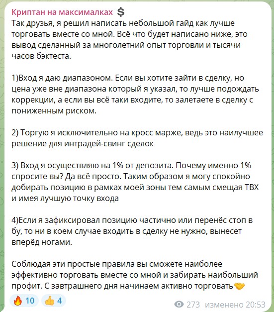 В отдельном посте на канале Телеграм Криптан на полную мощь. Дмитрий Беляев поделился стратегией торговли криптовалютой для своих новых подписчиков.