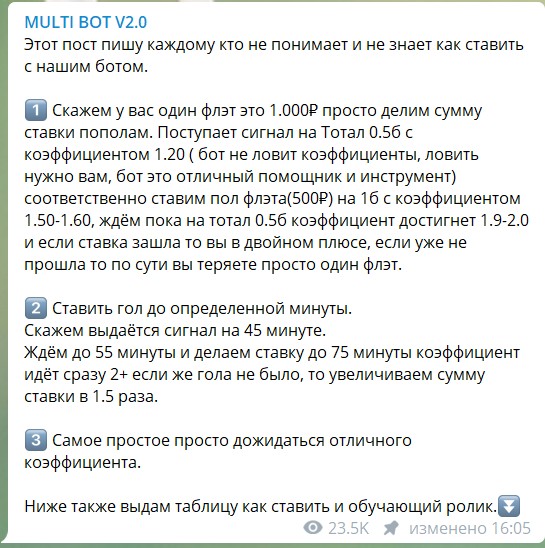 В интернете можно найти множество бесплатных и платных программ для анализа спортивных событий. Однако до сих пор не создано ни одного действительно эффективного инструмента, который бы гарантировал успешные ставки в букмекерских конторах на основе сигналов. Telegram-канал Multi Bot V2.0 предлагает прогнозы от бота по определенной стратегии. Но наш анализ показал, что если следовать всем сигналам без разбора, это приведет к значительным убыткам, несмотря на демонстрируемую статистику, где преобладают плюсы. Ниже объясняем, почему так происходит.