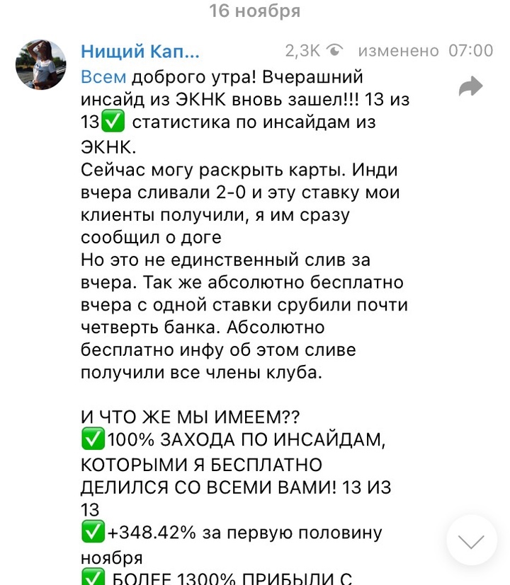 За эту сумму клиентам обещают доступ к прогнозам, стратегиям, инсайдам и обучению в формате LIVE. В случае минусового результата Нищий Каппер гарантирует частичный возврат проигранных средств через букмекерскую контору, которая выплачивает ему 40% от потерь привлечённых игроков.