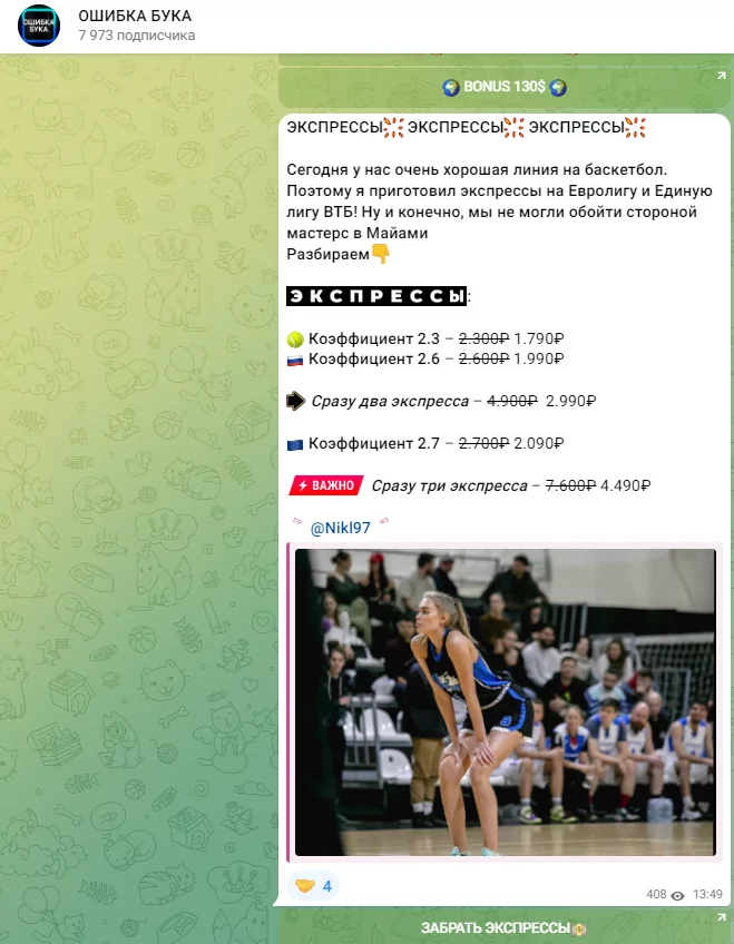 «Ошибка бука» — это Telegram-канал, предлагающий как платные, так и бесплатные прогнозы на спорт: хоккей, футбол, баскетбол и другие дисциплины. Наша команда скептически относится к подобным проектам, считая, что попытка охватить множество направлений в беттинге редко приводит к успеху.