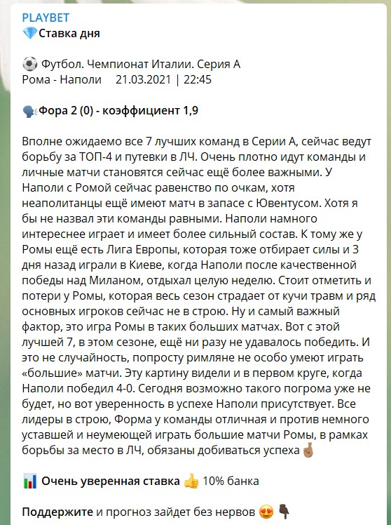 Ключевая особенность канала – публикация бесплатных прогнозов. Причем каждое предложение сопровождается обоснованием выбора: