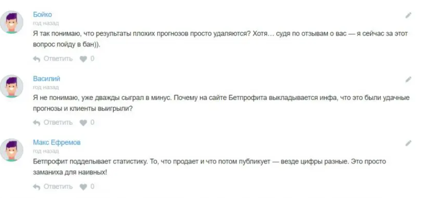 Отзывы о прогнозах Profit Bet в основном негативные. Клиенты жалуются, что им предлагают ставки сомнительного качества с проходимостью ниже 10%. После покупки прогнозов пользователи часто остаются ни с чем.