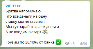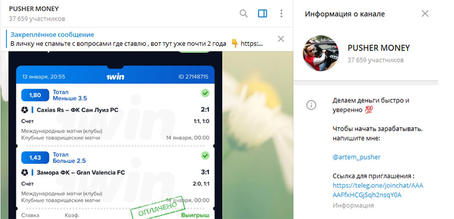 В Telegram-канале Pusher Money предлагают продажу инсайдерской информации и договорных матчей с отличной проходимостью.