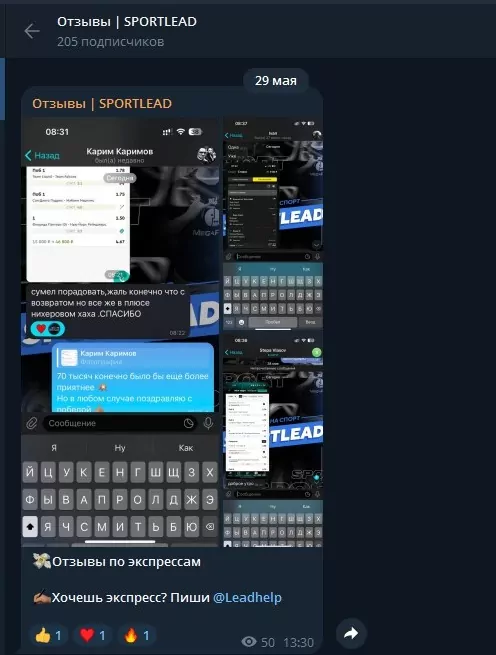 На профильных сайтах отзывов о проекте почти нет, что говорит о его низкой популярности среди реальных беттеров. Комментарии в канале отключены, но есть отдельный чат «Отзывы SportLead Ставки на спорт» с переписками клиентов. Там только позитив: благодарности и обещания вернуться за новыми прогнозами. Негатив отсутствует — вероятно, его удаляют, чтобы поддерживать имидж.