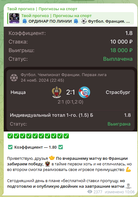 Из отзывов видно, что Твой Прогноз не верифицирует свою статистику. Прогнозы публикуются без идентификации беттера, что делает невозможным проверку их точности. Надежные капперы всегда подтверждают свою статистику и не скрывают информацию от подписчиков, в отличие от этого канала.